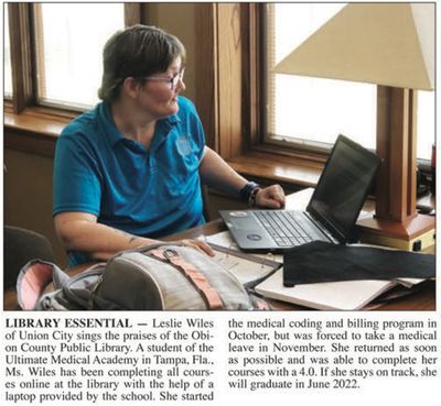 Ms. Wiles knows she would have never been able to get as far as she has withoutthe library. "Two things have gotten me through this program, the grace of God and the Obion County Public Library. The library is my safe haven," she said.